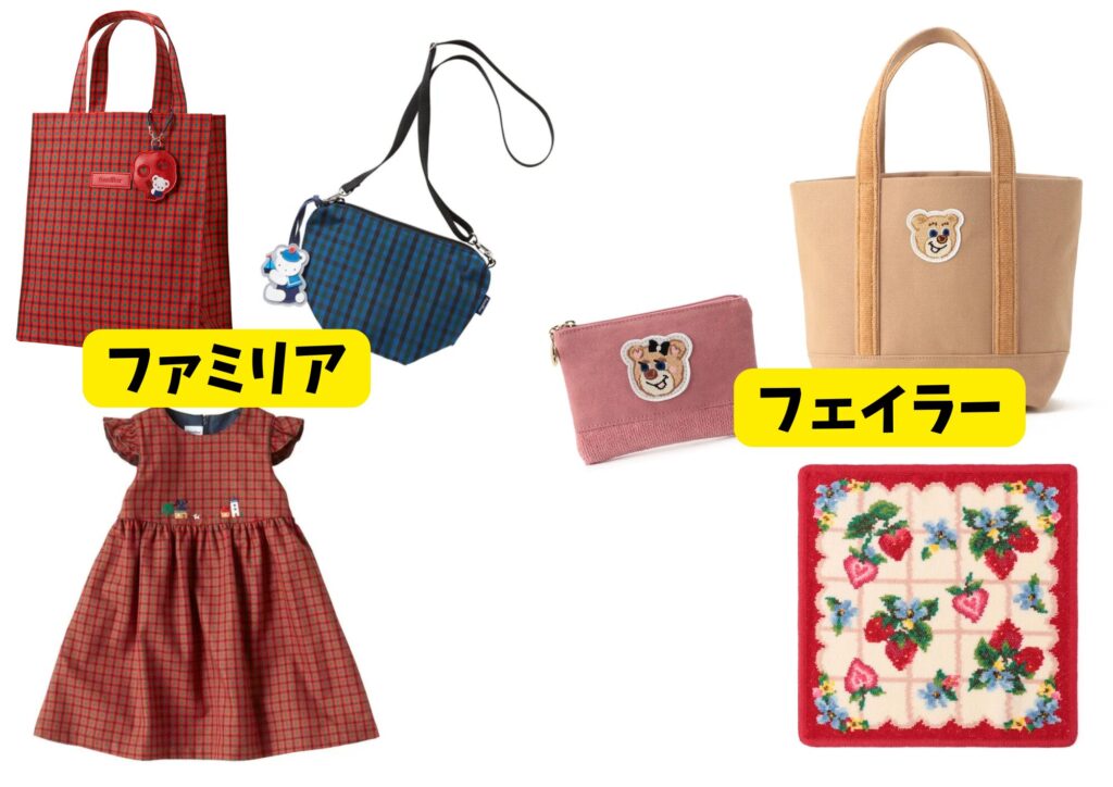 「ファミリア」は神戸発の子供服ブランド、「フェイラー」はドイツ発のハンカチやバッグが人気のブランドです。