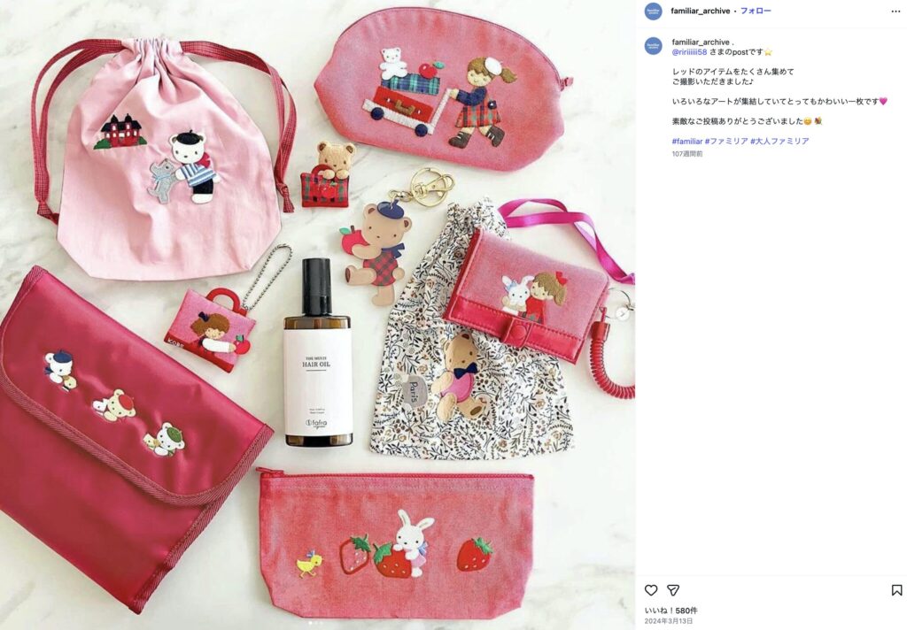 一方のファミリアは、タグをつけて投稿すると「ファミリアアーカイブ」という公式インスタが投稿をリポストしてコメントまでつけるというマメさ。